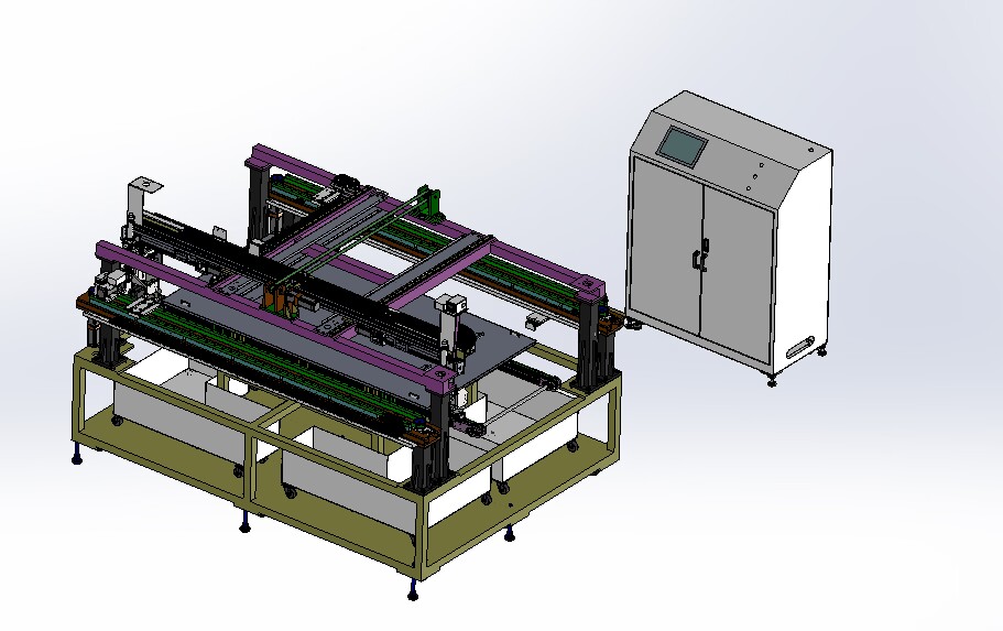 自動(dòng)排版機(jī)的主要功能單元有:玻璃輸送定位系統(tǒng)、抓取行走系統(tǒng)、視覺(jué)檢測(cè)系統(tǒng)、電控系統(tǒng)等;通過(guò)以上功能單元,實(shí)現(xiàn)了將自動(dòng)串焊機(jī)串焊好的電池串,按照工藝尺寸要求和排版方向順序自動(dòng)排版鋪設(shè)到玻璃(EVA已經(jīng)鋪設(shè))上,組成電池串陣列。玻璃/EVA通過(guò)傳輸線傳輸至指定位置,機(jī)械手抓取電池串實(shí)現(xiàn)CCD定位、自動(dòng)旋轉(zhuǎn)、自動(dòng)排版功能。設(shè)備通過(guò)同步帶傳輸與自動(dòng)生產(chǎn)線對(duì)接,實(shí)現(xiàn)了自動(dòng)流水作業(yè)。